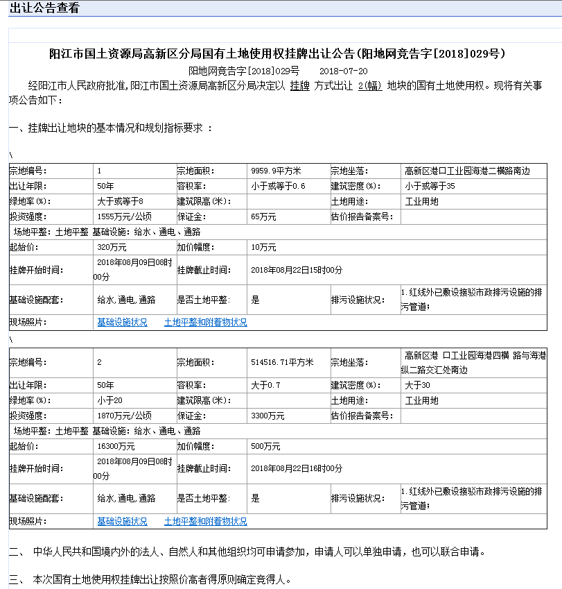 陽江市國土資源局高新區分局國有土地使用權掛牌出讓公告(陽地網競告字[2018]029號)