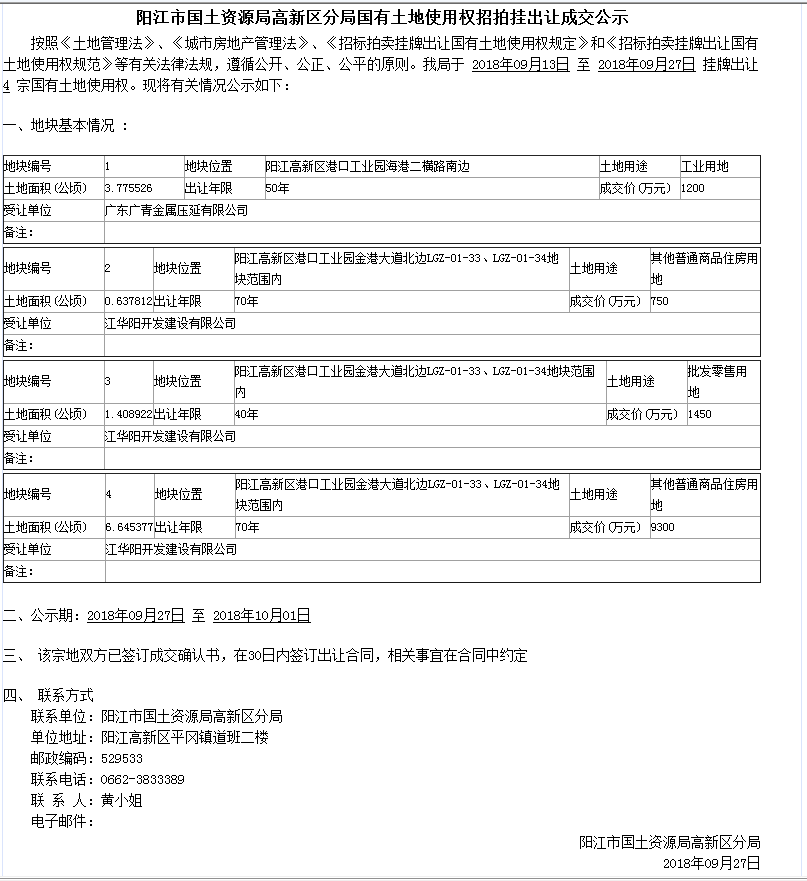 陽江市國土資源局高新區分局國有土地使用權招拍掛出讓成交公示