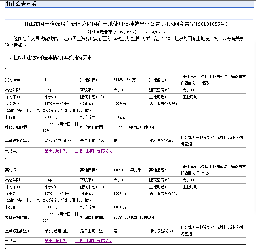 陽江市國土資源局高新區分局國有土地使用權掛牌出讓公告(陽地網競告字[2019]025號)