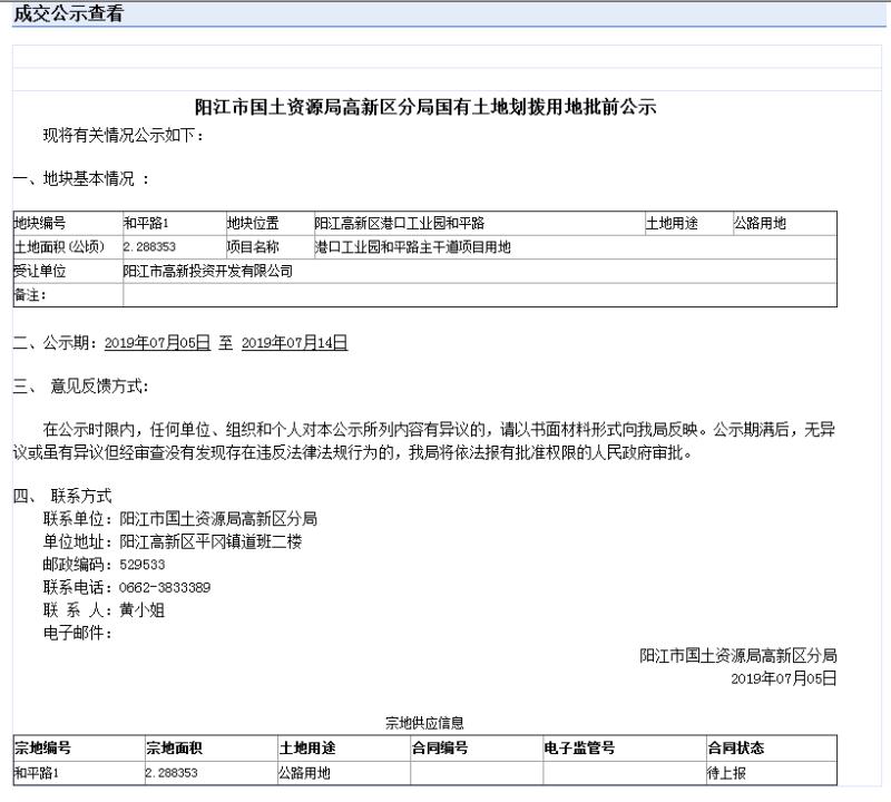 陽江市國土資源局高新區分局國有土地劃撥用地批前公示(高新公司)
