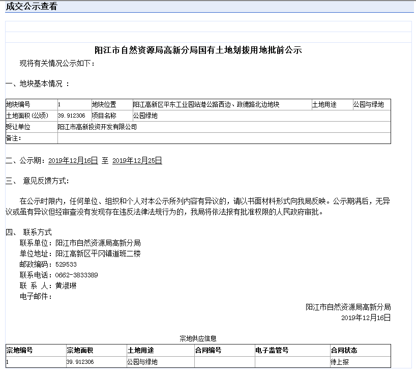陽江市自然資源局高新分局國有土地劃撥用地批前公示