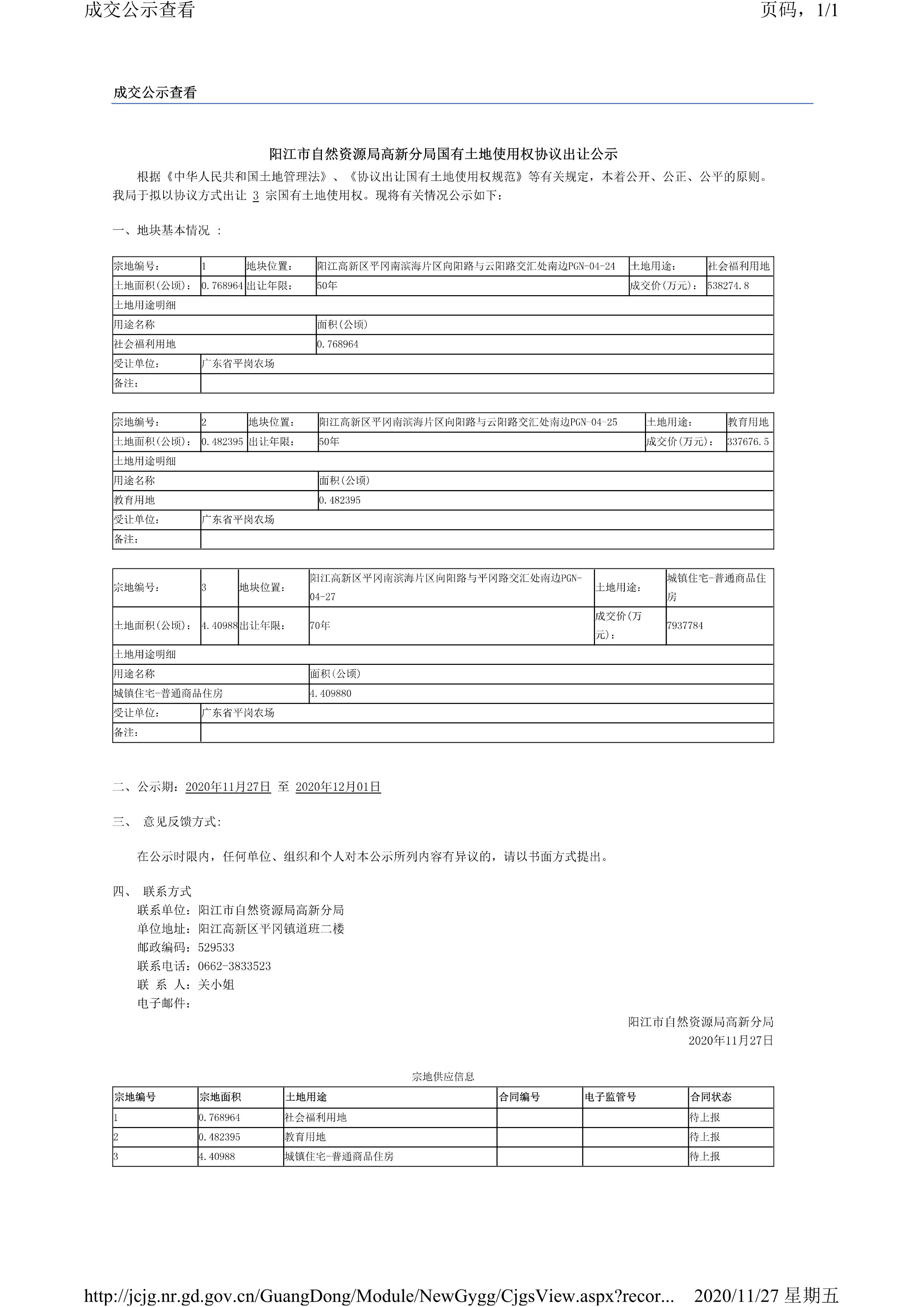 陽江市自然資源局高新分局國有土地使用權協議出讓公示(廣東省平崗農場)