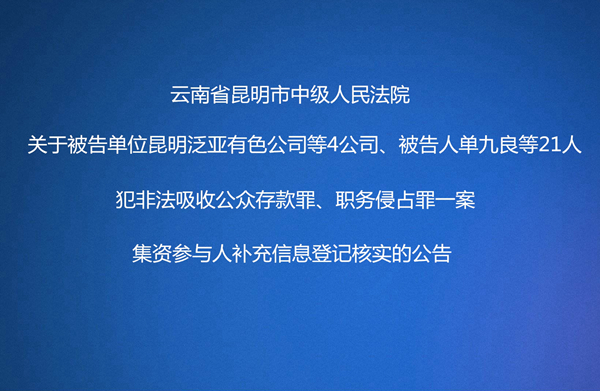 云南省昆明市中級人民法院關于被告單位昆明泛亞有色公司等4公司、被告人單九良等21人犯非法吸收公眾存款罪、職務侵占罪一案集資參與人補充信息登記核實的公告