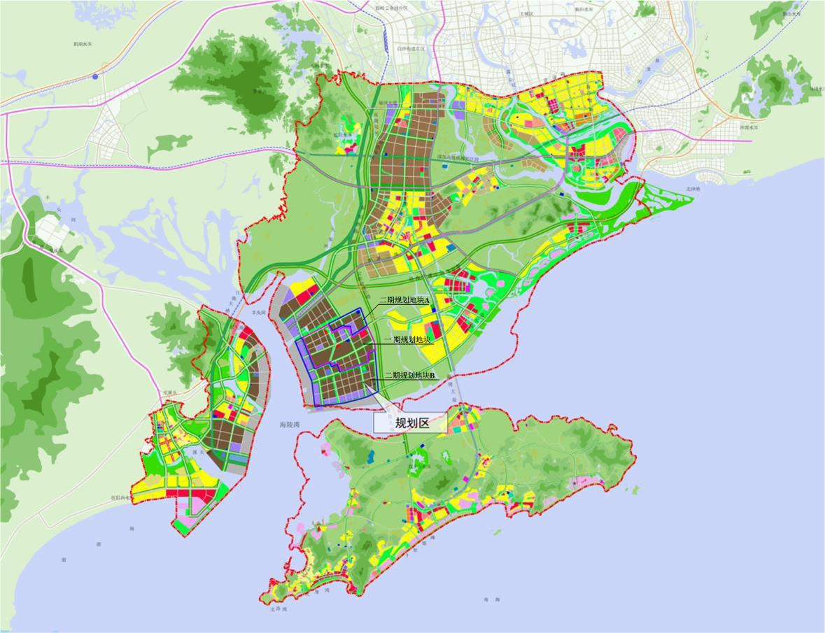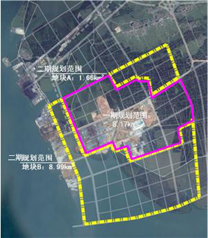 ②規劃范圍:規劃區位于陽江高新區臨港片區南部,云陽高速聯絡線兩側,有國家一類口岸陽江港,與海陵島隔海相望。一期用地北以規劃海港一橫路為界,南至規劃海港四橫路,西至海陵灣大堤,東至四墩河,總面積為8.17km2。二期用地圍繞一期用地南北兩側開展,包括南北兩個地塊,其中,北部地塊(簡稱“地塊A”)范圍北以規劃海港一橫路為界,南至云陽高速聯絡線,西至規劃海港縱一路,東至規劃吉祥東路,規劃面積約1.66km2;南部地塊(簡稱“地塊B”)范圍北至規劃海港一橫路,南至規劃濱海大道,西至規劃疏港大道,東至規劃吉祥東路,規劃面積約8.99km2。規劃區總面積為18.82km2。