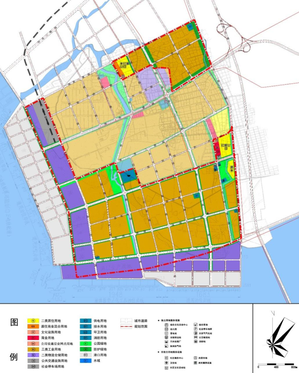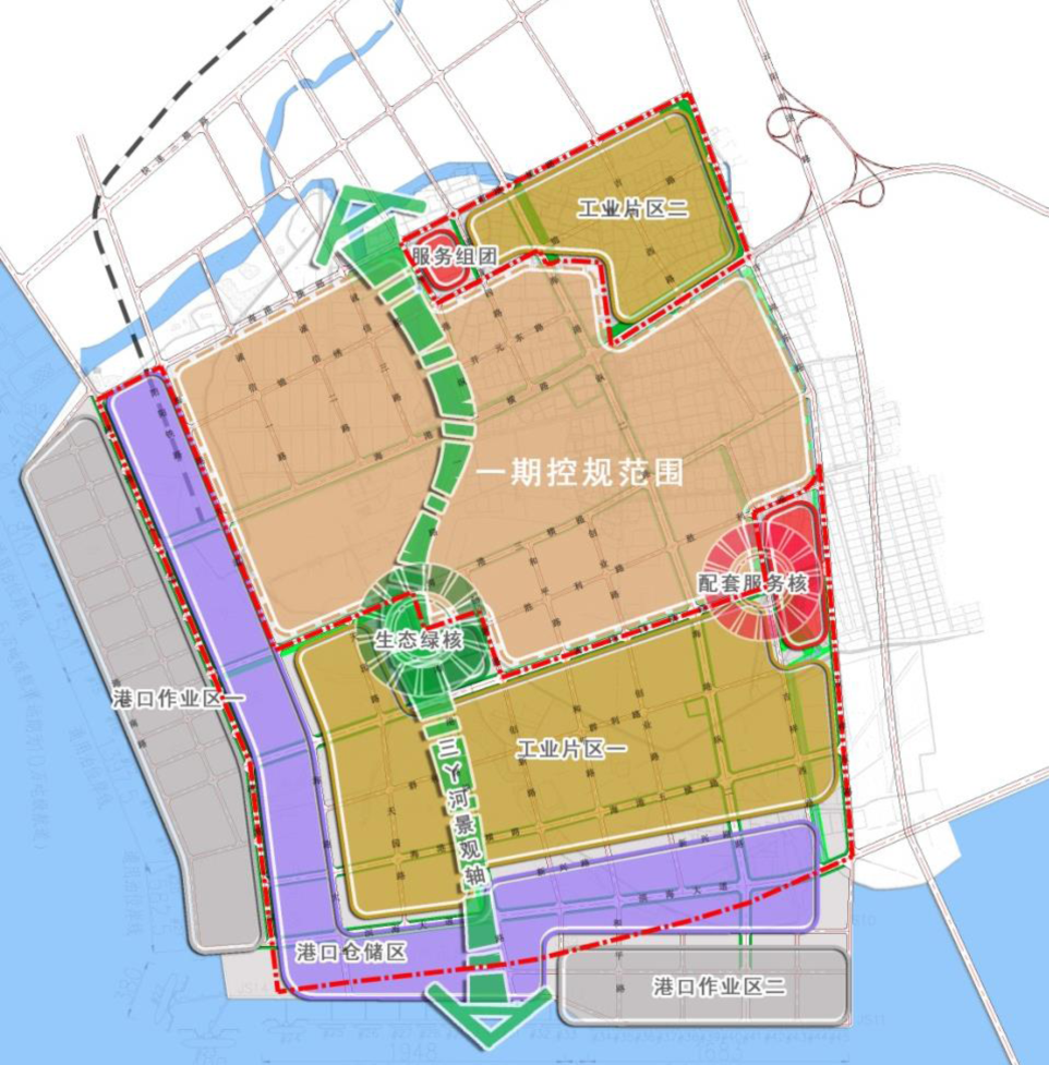 港口工業園二期總用地面積約為1065.34公頃。其中,將原1051.04公頃非城市建設用地轉化為城市建設用地。規劃城市建設用地中,產業發展用地(包括工業用地、物流倉儲用地)占總建設用地的66.36%。規劃區范圍內常住人口1.28萬人。